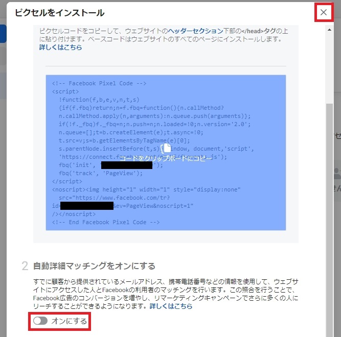「コードをコピー」をクリックするとピクセルコードをコピーすることができます。